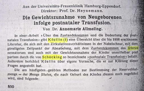 | Allmeling (1930) measured weight gain in 100 infants during the period of postnatal transfusion. She also cited and summarized several research articles that predated hers by more than 50 years (Kostlin 1898), Hofmeier 1878). Her work was cited and confirmed by Gunther (1957). |